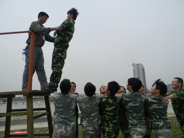 在做“高臺背摔”拓展訓練時,隊員們協同配合,親密無間,增進了對團隊的信任。
