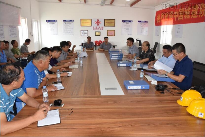 雙方在會議室對項目安全生產管理工作進行溝通交流。考察團一行聽取我集團援佛大項目管理組、施工技術組工作匯報并對本次檢查活動作了具體安排和部署。龍信集團駐場代表施錦元代表項目部歡迎檢查組的到來,他表示:正值中非合作論壇北京峰會召開之際,中國建設科技集團徐總一行來我集團援佛大項目進行安全檢查指導,是對我們的巨大鼓舞和支持,目前項目部正開展2018年“安全月”活動,通過本次檢查指導,定將促進和推動項目安全生產邁上更高臺階。