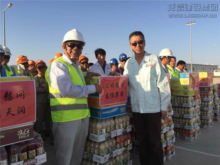 此次慰問活動中,楊清林主席走到龍信隊伍前,與龍信集團海外公司領導楊秉法與仇勇經理進行了親切交談。他高興地表示:龍信在5家土建分包單位中任務很重,成績顯著、工作領先,對400多名龍信建設者付出的努力給予肯定和贊賞,對楊局親臨生產一線,駐守在環境如此惡劣的沙北工作表示感謝!隨后楊主席與龍信的同志們進行了合影。